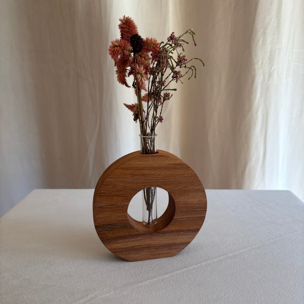 Cercle en orme huilé conçu pour être posé sur une table, une étagère ou un meuble. Un trou central accueille une éprouvette en verre incluse, parfaite pour mettre en valeur des fleurs sèches ou fraîches, ou encore pour y glisser une éprouvette à épices.