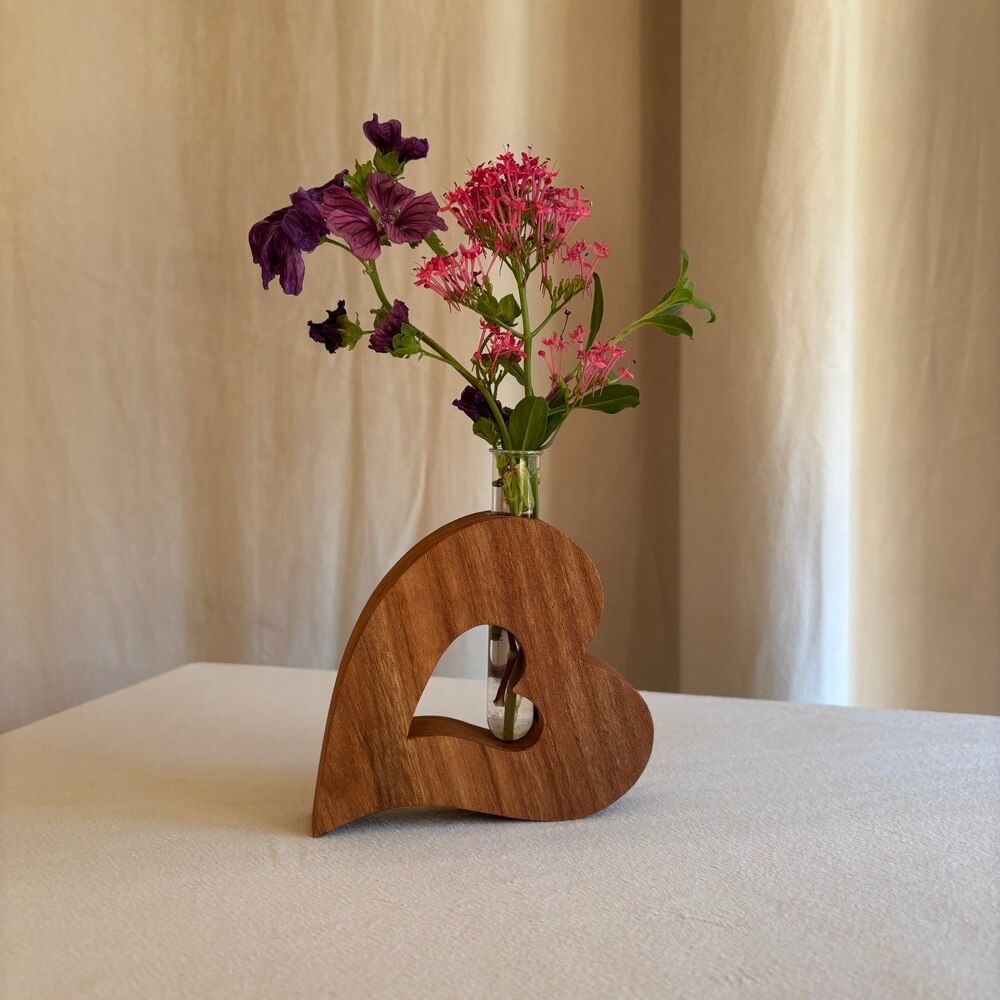 Cœur en orme huilé conçu pour être posé sur une table, une étagère ou un meuble. Un trou central accueille une éprouvette en verre incluse, parfaite pour mettre en valeur des fleurs sèches ou fraîches, ou encore pour y glisser une éprouvette à épices.