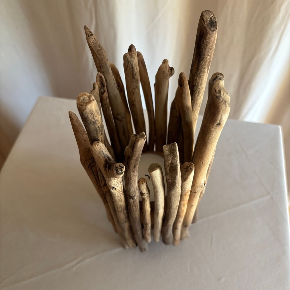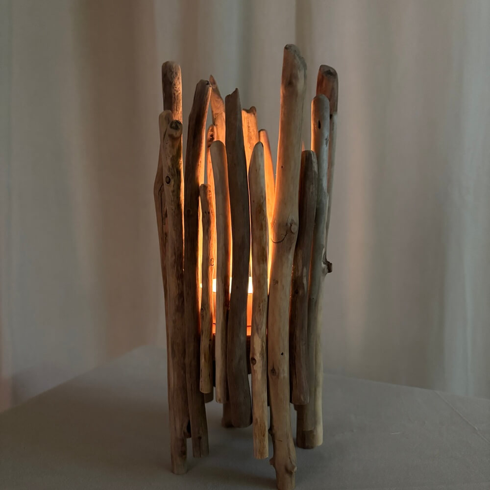 Photophore en bois flotté naturel, idéal pour une petite bougie. La lumière se diffuse entre les bois pour un rendu chaleureux et authentique, parfait sur une table à manger.